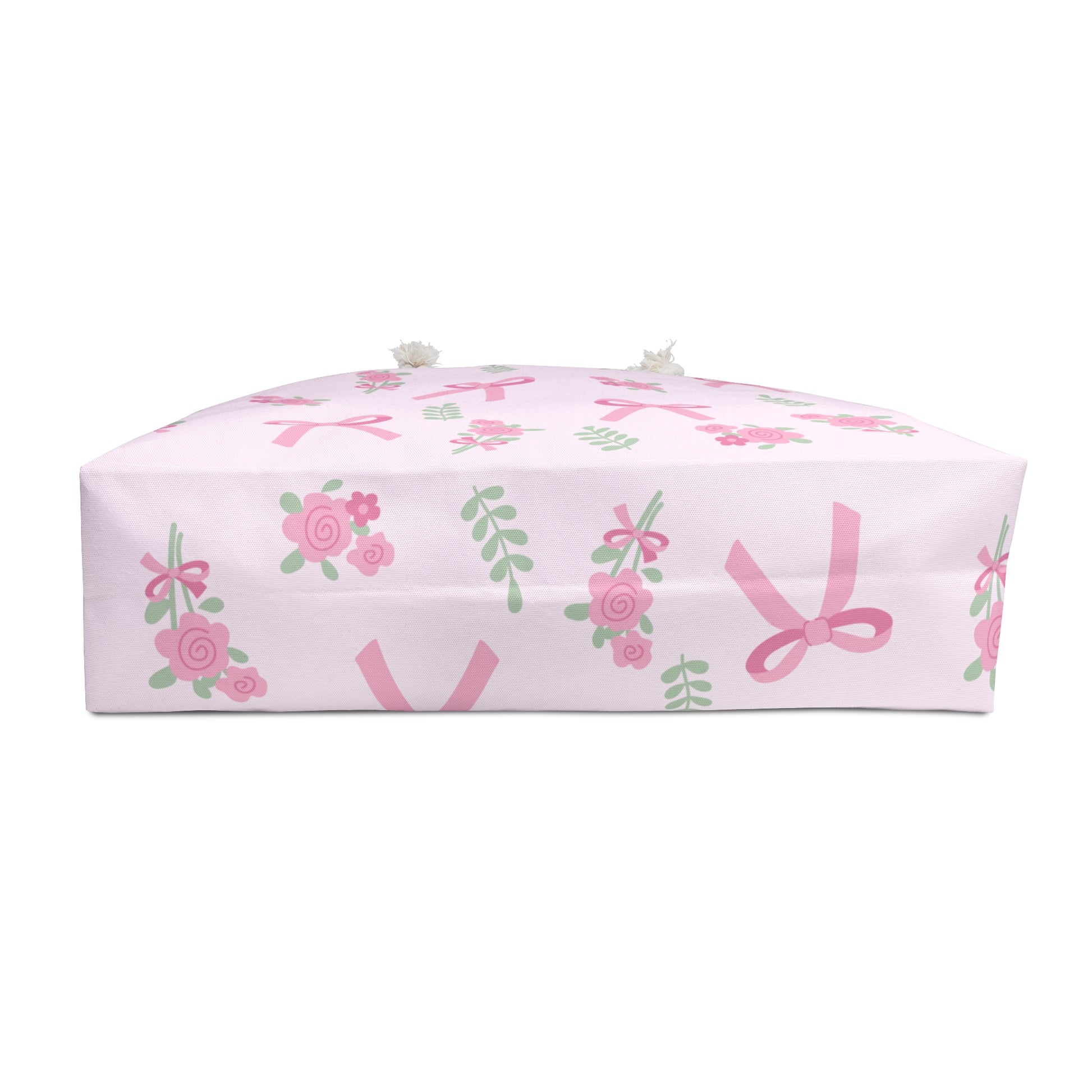 Bow tote bag with floral print, perfect for a beach day or weekend trips. This spacious weekender bag is ideal for those who love weekend getaways and outdoor adventures. It's a must-have for beach lovers and travel enthusiasts. Great for summer vacations, road trips, and weekend escapades.
